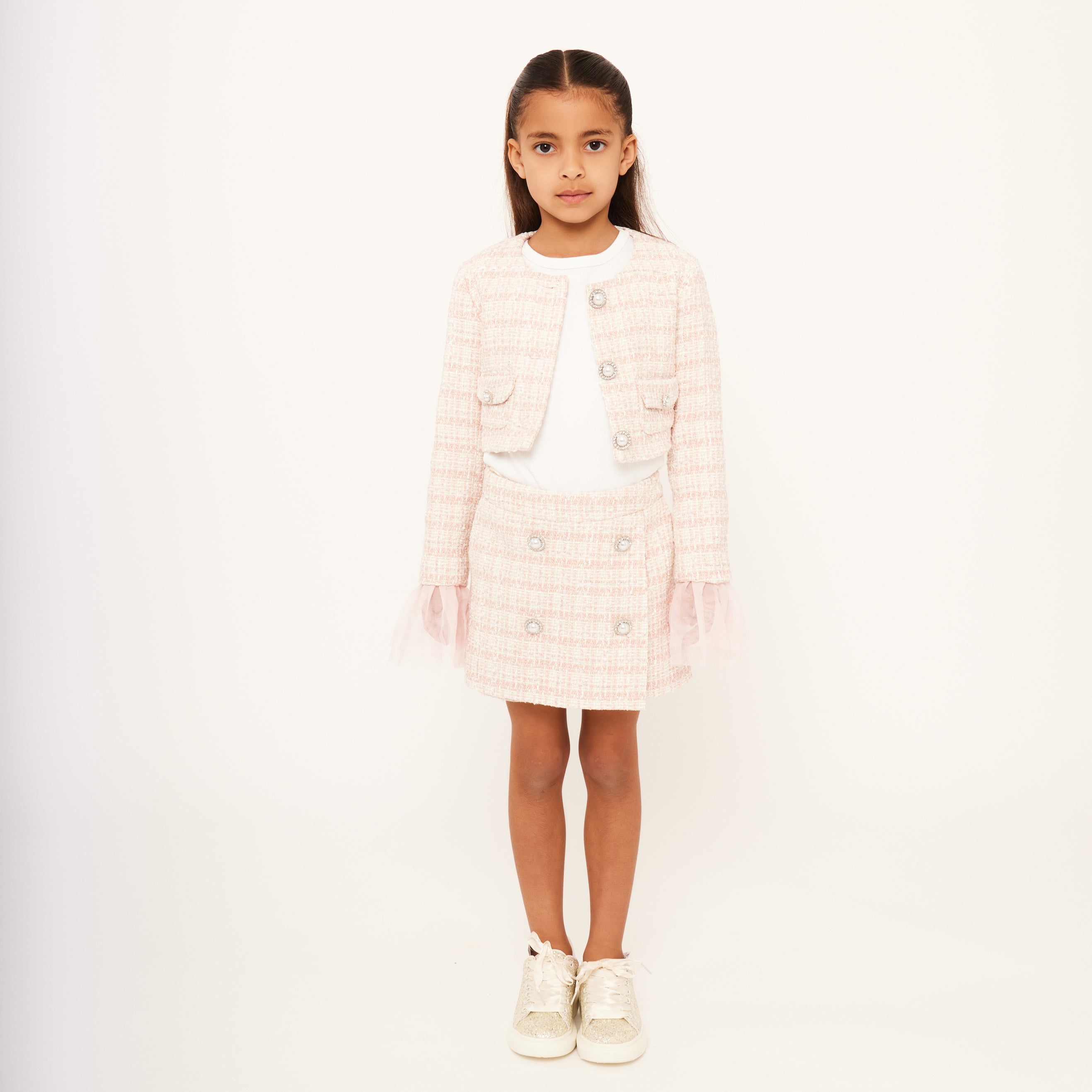 Tweed jacket lined in a soft viscose fabric. Round neck adds a touch of elegance. Completed with tulle cuffs and pearl and rhinestone buttons.